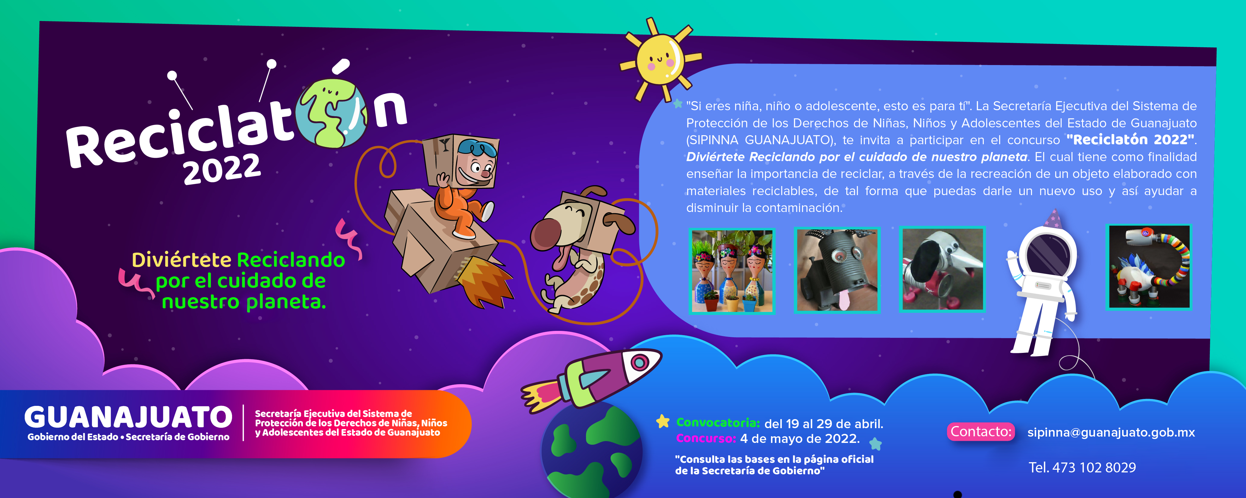 “Si eres niña, niño o adolescente, esto es para ti” … La Secretaría Ejecutiva del Sistema de Protección de los Derechos de Niñas, Niños y Adolescentes (SIPINNA Estatal), te invita a participar en el concurso “Reciclatón 2022”. Diviértete Reciclando por el cuidado de nuestro planeta. El cual tiene como finalidad enseñar la importancia de reciclar, a través de la recreación de un objeto elaborado con materiales reciclables, de tal forma que puedas darle un nuevo uso y así ayudar a disminuir la contaminación. Descarga las bases aquí.